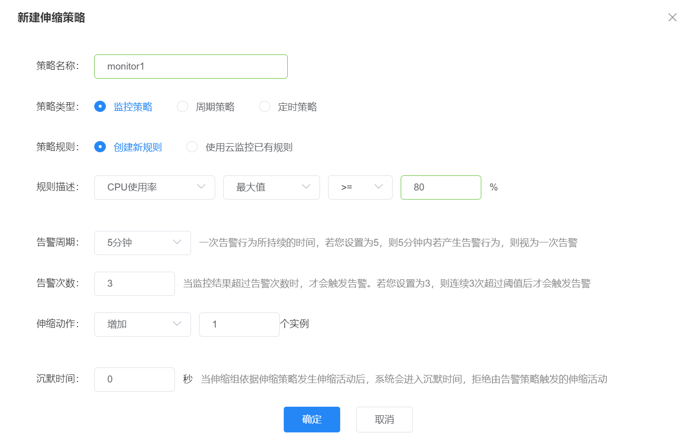 监控策略:根据设定的告警规则(例如CPU使用率等)、告警周期和次数,来触发伸缩动作。