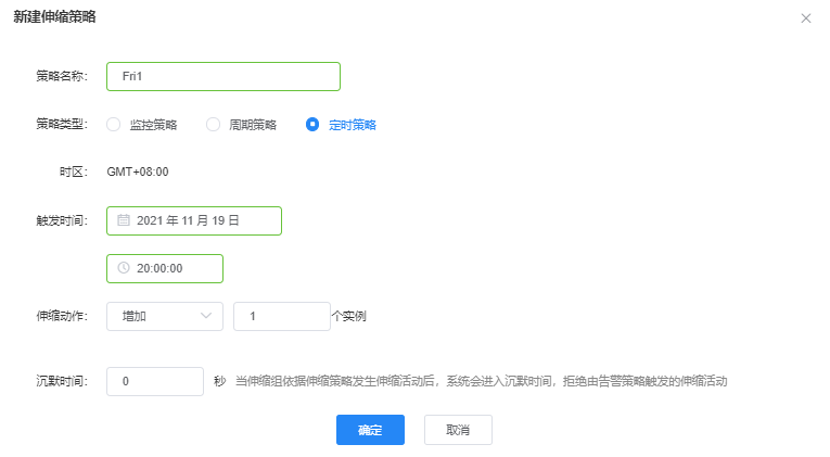 定时策略:设定伸缩时间,到达该时间时即进行伸缩动作。为一次性执行事件。