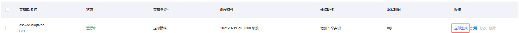 (可选)启用策略后,如果需要立即执行伸缩动作,可以单击伸缩策略后的“立即生效”。系统会执行一次伸缩动作。