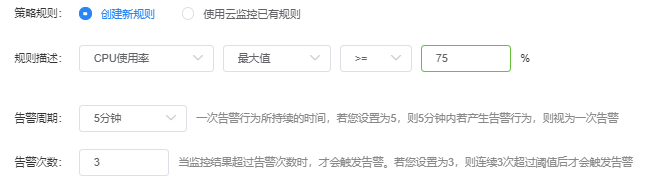 策略规则:设置监控告警的阈值规则。可以选择创建新的规则,也可以选择使用云监控中已有的规则。
