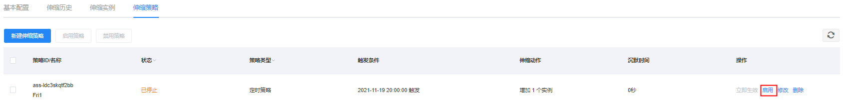 返回到伸缩策略页面,单击伸缩策略后的“启用”,启用策略。