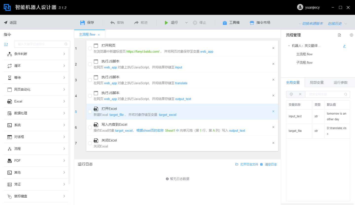 机器人工作台(Uni-Bot Studio),无代码机器人开发中心,内置机器人商店,提供丰富的组件、模板和第三方指令,实现用户设计和发布机器人业务流程。机器人工作台的软件截图如下所示: