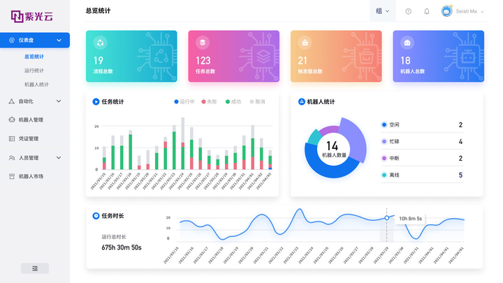 提供脚本和设备管理功能,列出所有脚本使用情况和执行器在线情况;提供总览统计,机器人运行统计,触发器统计信息;