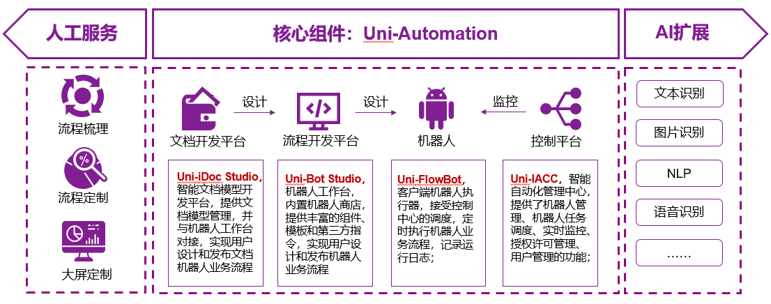 Uni-Automation提供人工服务,帮助用户在前期梳理流程、进行流程定制化开发,大屏定制等要求。使用户能够清晰的看到业务场景、清楚的知道流程中的每个具体步骤。