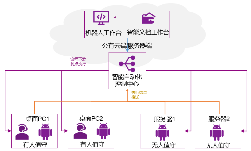 智能自动化控制中心可部署在公有云端或者私有服务器端,提供了机器人管理、机器人任务调度、实时监控、授权许可管理、用户管理的功能。