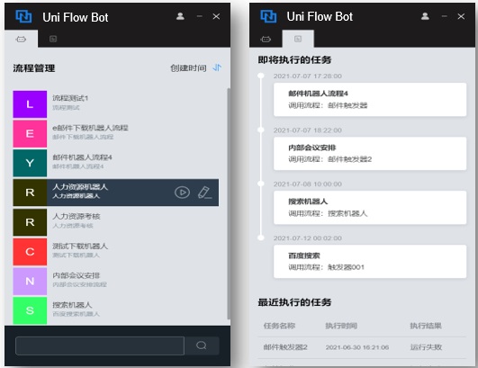 工作流机器人(Uni-FlowBot),客户端机器人执行器,接受控制中心的调度,定时执行机器人业务流程,记录运行日志。运行方式有无人值守和有人值守两大类型,无人值守可在包括虚拟环境的多种环境下运行;有人值守需人来控制流程开关。机器人执行器的软件截图如下: