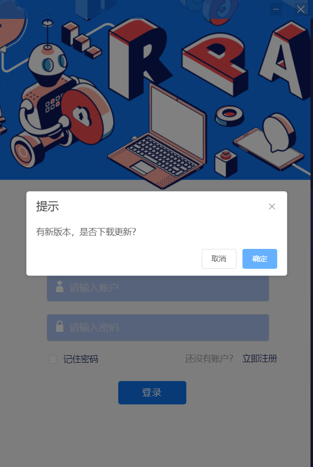 当工作台发布新版本时,系统会自动检测并提示是否需要进行更新。点击确定按钮进行更新,如下图所示: