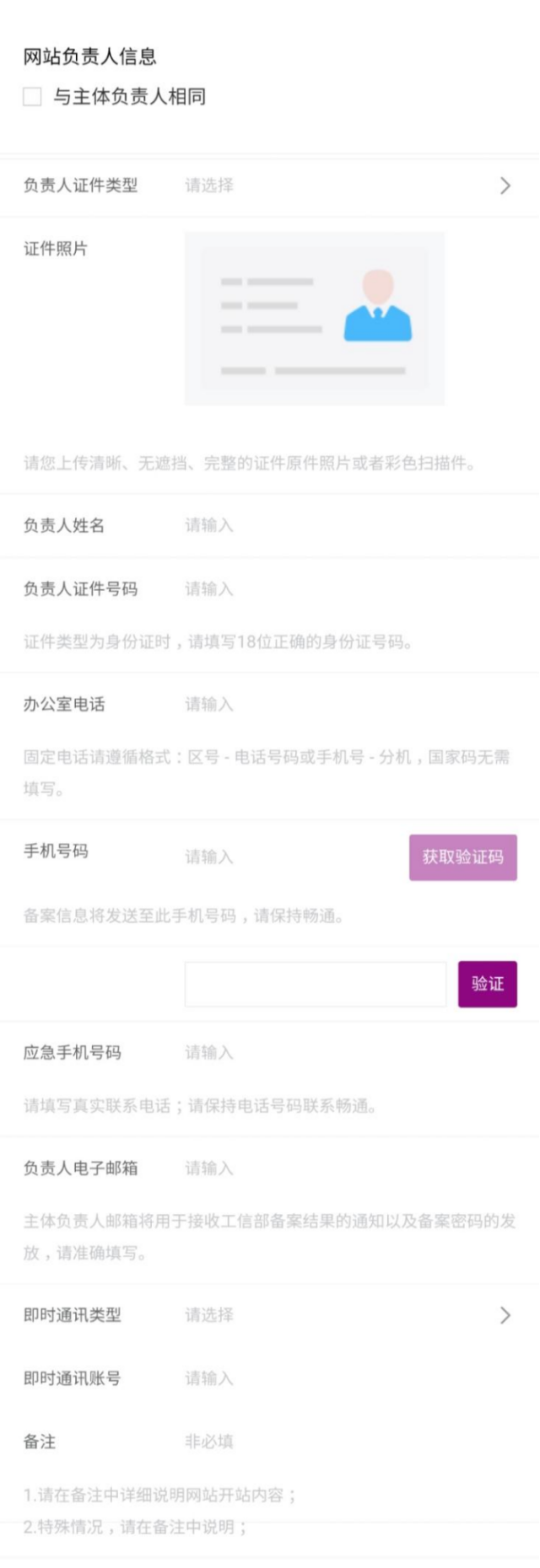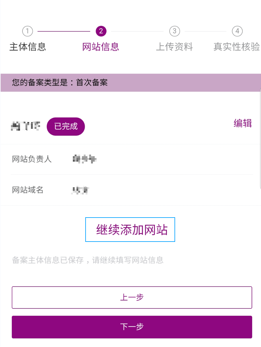 5、按照页面提示填写网站信息/网站负责人信息/网站接入信息,填写完成点击“保存网站”。