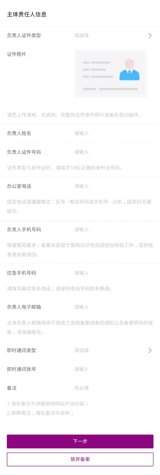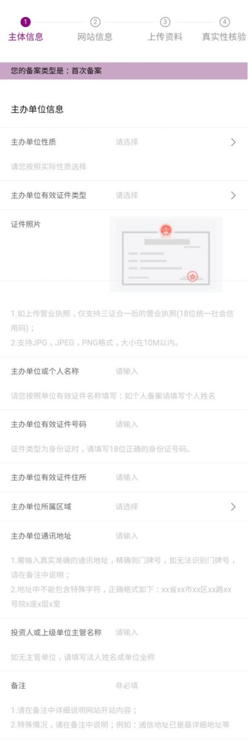 4、按照页面提示填写主体信息,填写完成点击“下一步”。