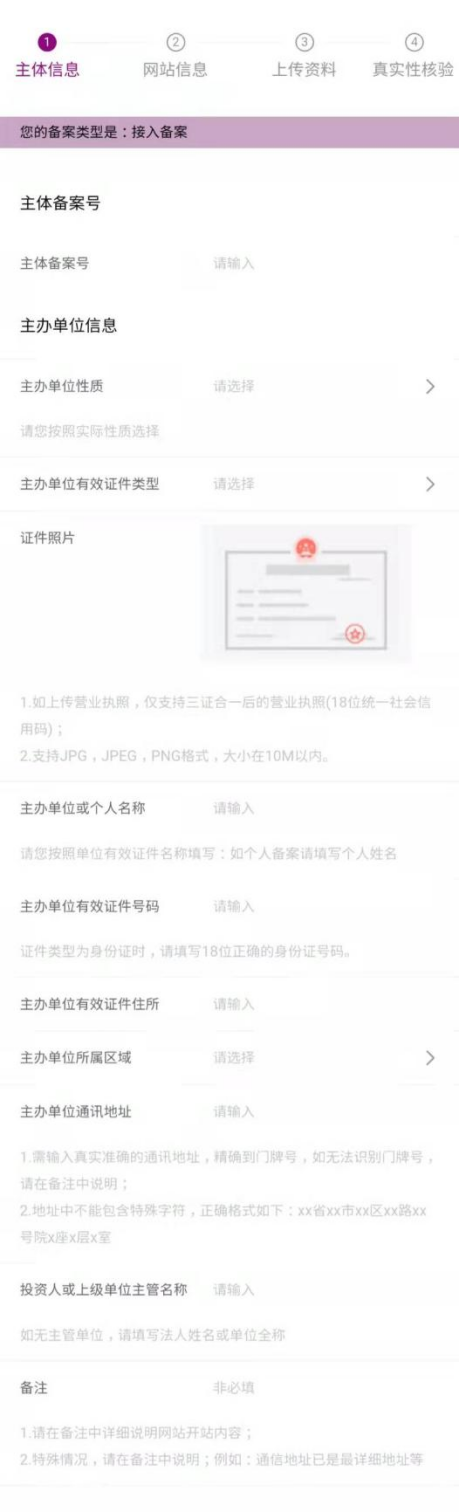 4、按照页面提示填写主体信息,填写完成点击“下一步”。