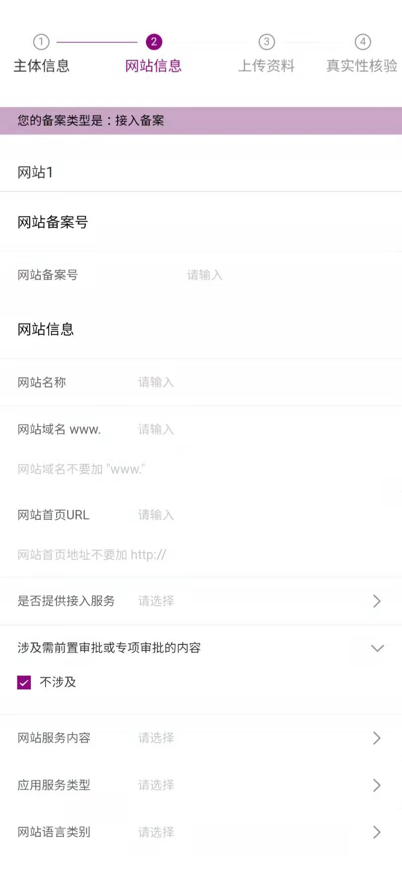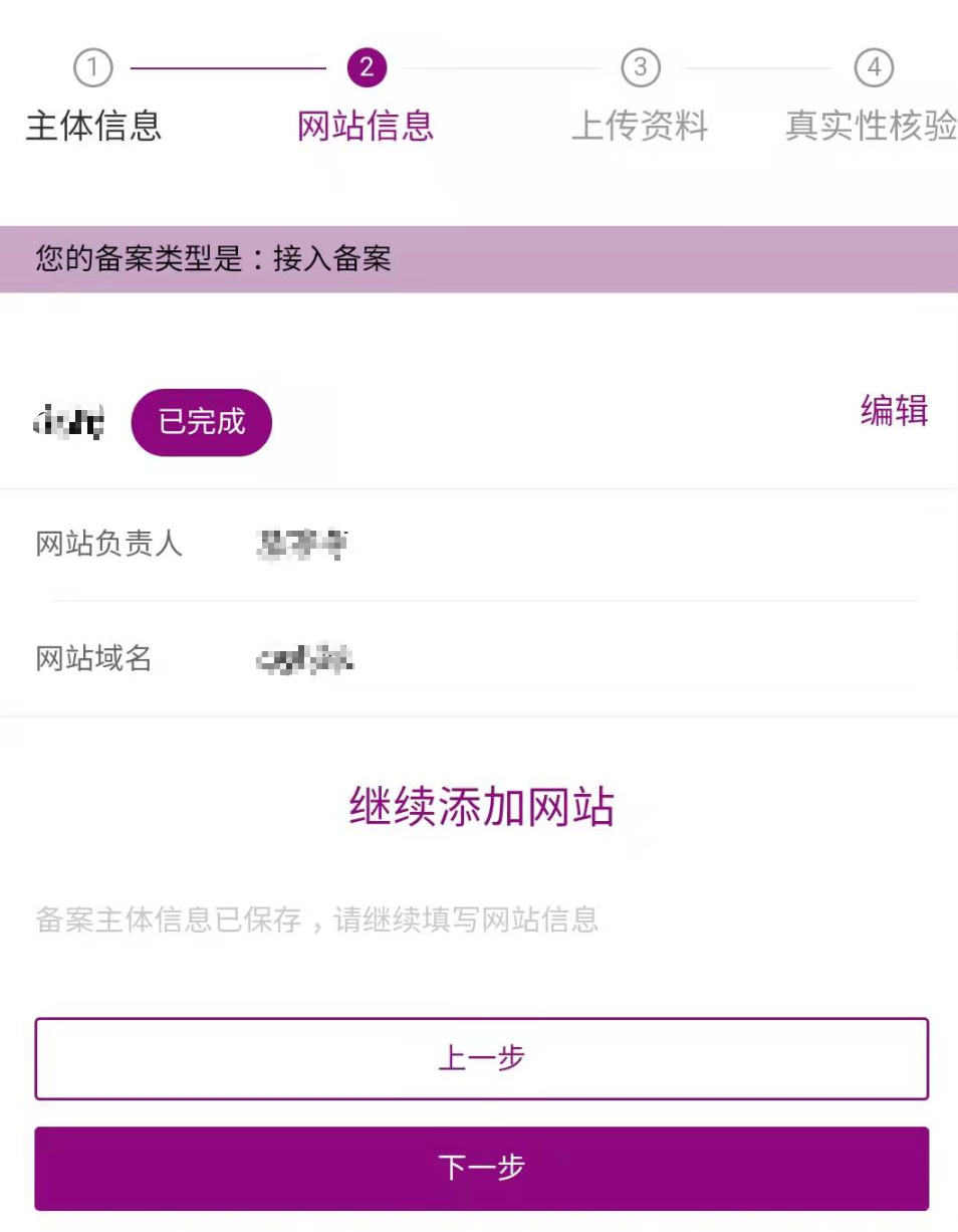 5、按照页面提示填写网站信息/网站负责人信息/网站接入信息,填写完成点击“保存网站”。