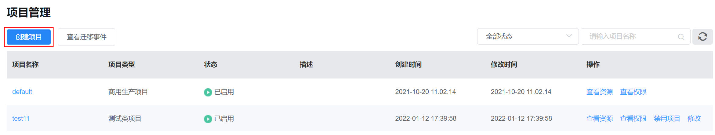 在页面上方菜单中,依次选择“资源 > 项目管理”,进入项目管理页面。