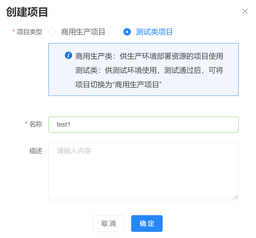 单击“创建项目”,选择项目类型,填写项目名称及描述。