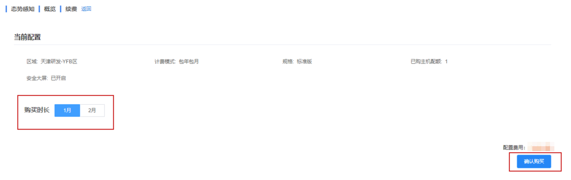 3. 在续费页面选择需要续费的时长,单击“确认购买”。目前仅支持一次续费1个月或2个月。