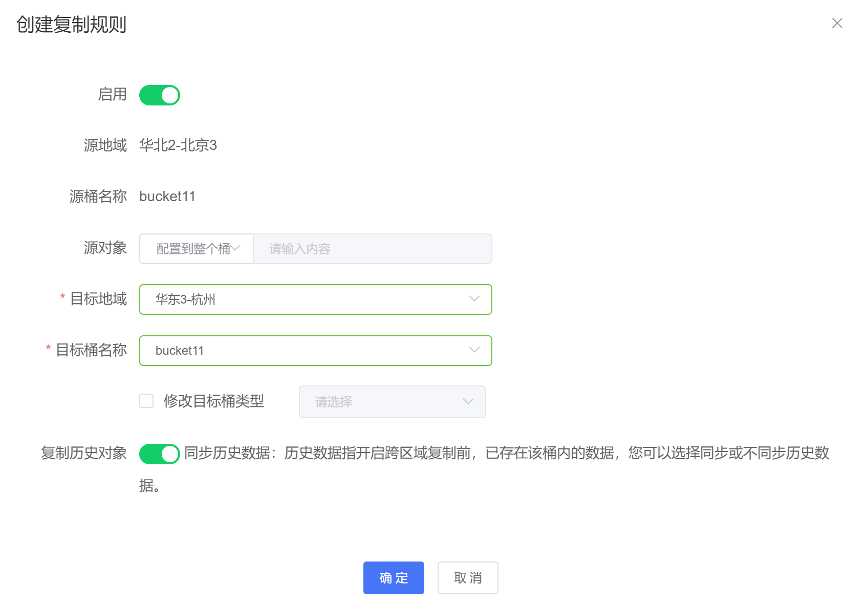 复制历史对象 | 默认不勾选,即只复制在开启跨区域复制功能后,源桶内新增的对象到目标桶。勾选后会复制开启跨区域复制功能前源桶内已有对象到目标桶。 注意:因开启跨区域复制前源桶和目标桶可能存在同名对象,勾选后可能导致目标桶对象被覆盖请谨慎操作。 |