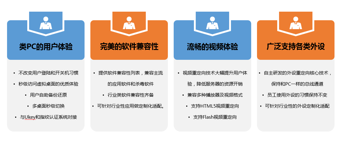不改变用户的登陆、开机和关机习惯。桌面连接协议VDP针对桌面图像传输进行深度优化,大幅提升桌面访问体验,可实现桌面秒级登陆。