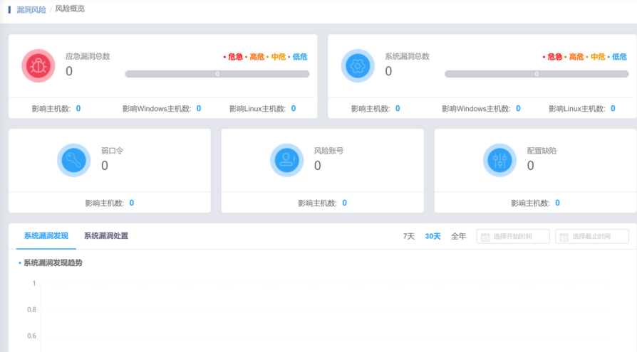 漏洞风险管理概览会显示当前主机上的漏洞风险情况,同时提供修复方案供用户进行参考;系统会根据漏洞策略库检测,对于存在漏洞风险的主机,会上报应用软件的名称、版本号、路径、发现时间,这个过程不会提取任何涉及用户隐私的数据。对于检测出的各类漏洞风险进行风险等级评估。