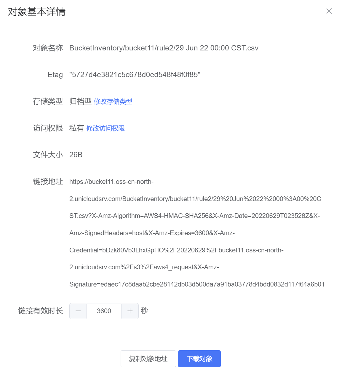 在文件详情页面,您看可以查看到对象的基本信息,包括对象名称、Etag、存储类型、访问权限、大小、链接地址等,并可以修改文件的存储类型、访问权限、链接有效时长等信息。
