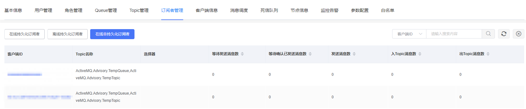 在线非持久化订阅者:单击“在线非持久化订阅者”页签,进入在线非持久化订阅者列表。