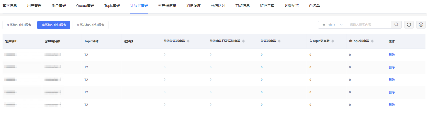 查看离线持久化订阅者:单击“离线持久化订阅者”页签,进入离线持久化订阅者列表。