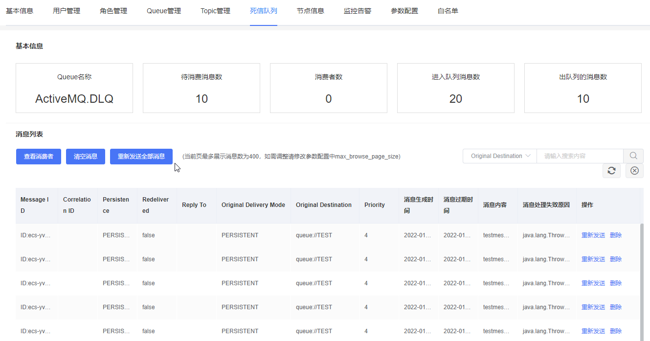 在死信队列消息列表页面,可以查看进入死信队列的消息,并且可以对指定消息进行重新发送、删除和清空消息等操作。