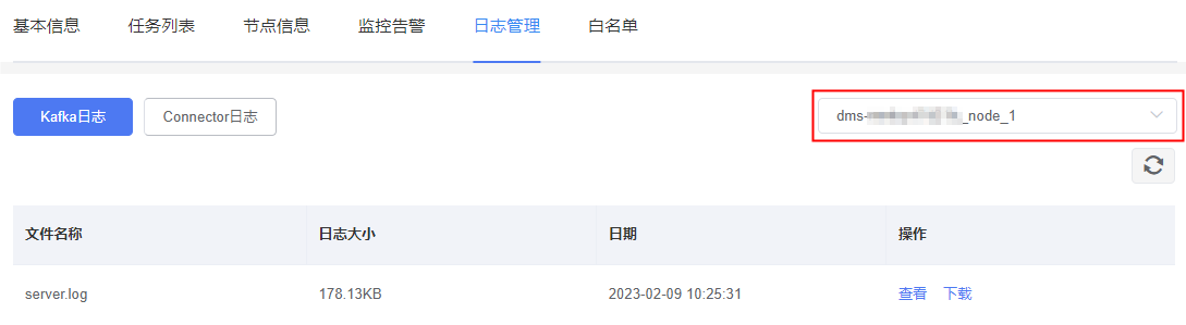 选择“Kafka日志”,并在页面右侧下拉列表中选择DMS实例节点,可以查看对应的日志列表信息。