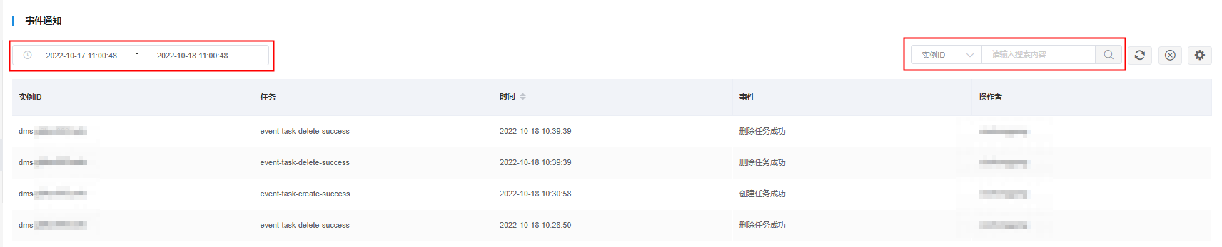 按类型查询日志:在任务中心页面,在下拉列表中选择分类(实例ID、任务、操作者),输入搜索内容进行查询。