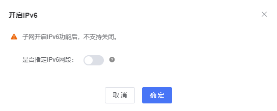 在“开启IPv6”对话框中,选择“是否指定IPv6网段”,如果不指定IPv6网段,系统将自动为子网分配IPv6网段,单击“确定”。