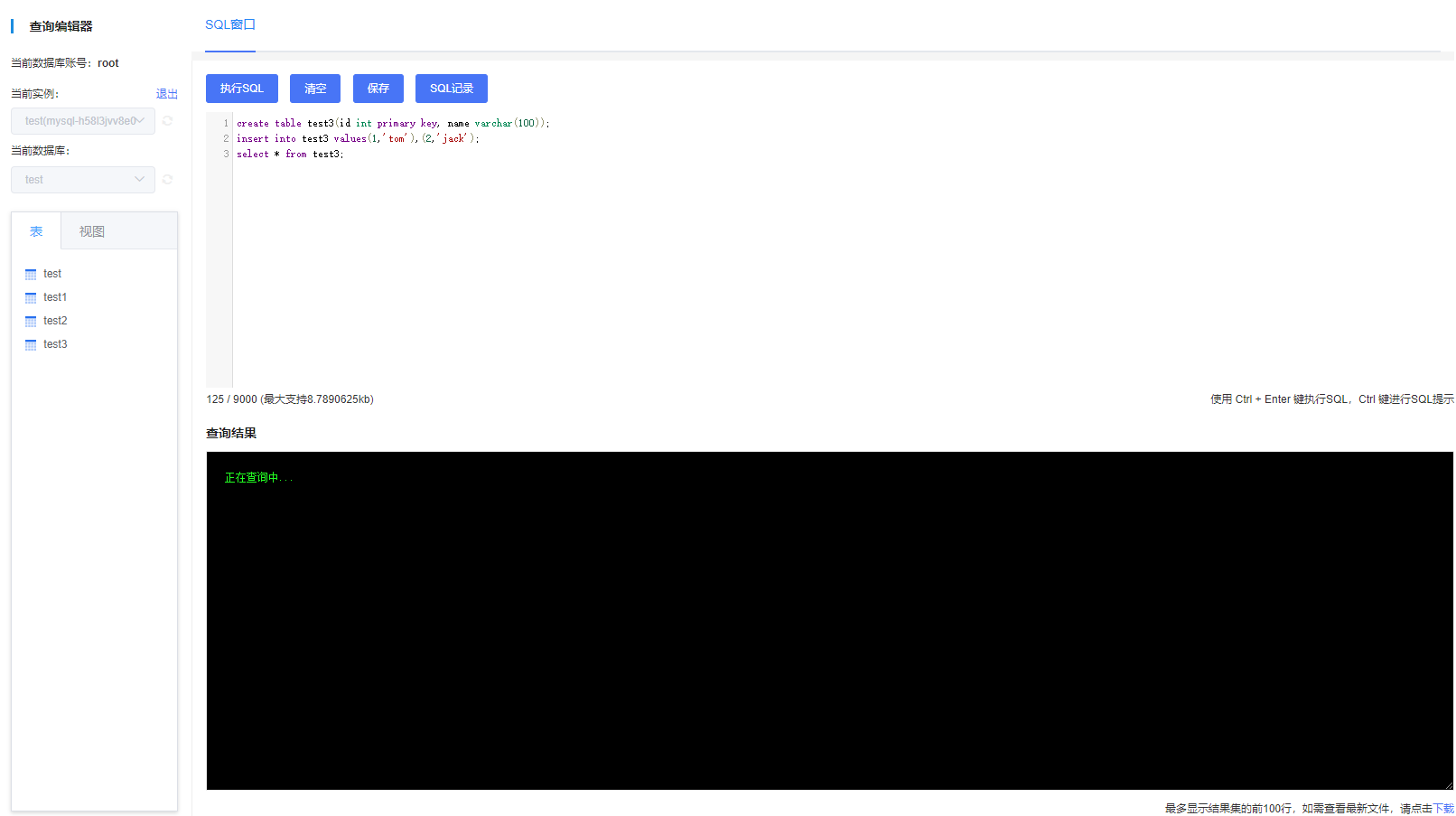 可以在交互界面写入要执行的SQL,并点击“执行SQL”,等待一段时间后的查询结果。点击“清空”可以立即清空交互界面写入的SQL。目前单次执行SQL最大支持9000个字符。