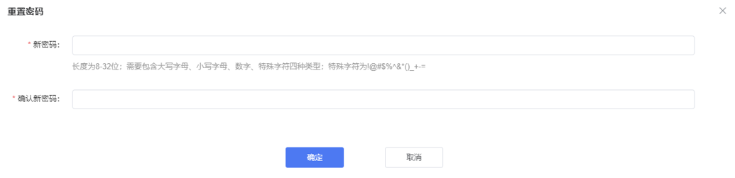 选择账号管理页签,单击待重置密码账号操作列的“重置密码”。输入新的密码,单击“确认”。