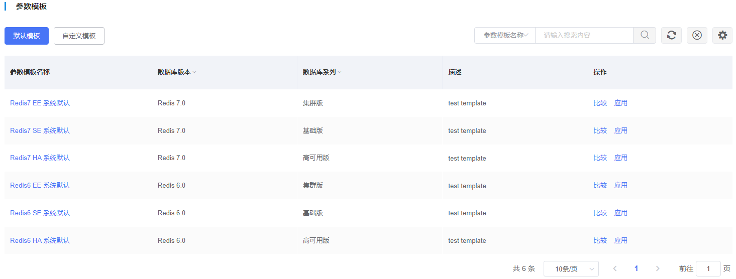 在云数据库导航栏中,选择“参数模板”,该模板展示了各架构的系统默认模板,包含Redis 6.0基础版/高可用版/集群版、Redis 7.0基础版/高可用版/集群版。单击参数模板名称可以查看默认参数。