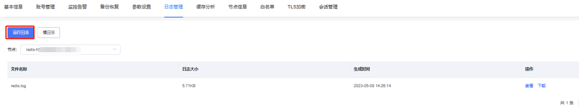 选择“日志管理”页签,进入运行日志界面,查看日志信息。集群可以查看节点日志。
