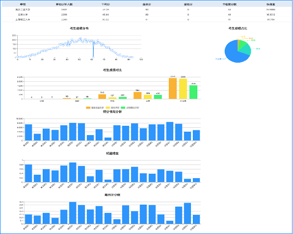6.试卷分析:用于对每次考试成绩按全体参考人数和各个学校参考人数分别进行统计分析,通过数据和图表的形式进行直观地展示分析,支持导出分析报告。