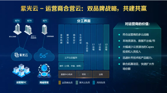“运营商合营云”是紫光云契合移动伙伴大会背景和主题,重点向各界展示的产品解决方案。运营商合营云与运营商联合构建、联合运营,实现优势互补,由紫光云提供专业的本地化运维服务、等保三级机房环境;运营商提供全域优质链路资源覆盖;采取“一级节点+城市节点”的两级架构模式,确保客户数据本地存储,关键数据不出城,实时保障客户数据安全;此外紫光云支持部分定制开发以满足各类型客户需求,结合强大的MSP团队对客户实际业务需求进行实际调研,开展业务梳理,结合强大的研发能力,完美契合客户实际业务需求,有效助力百行百业数字化转型升级。